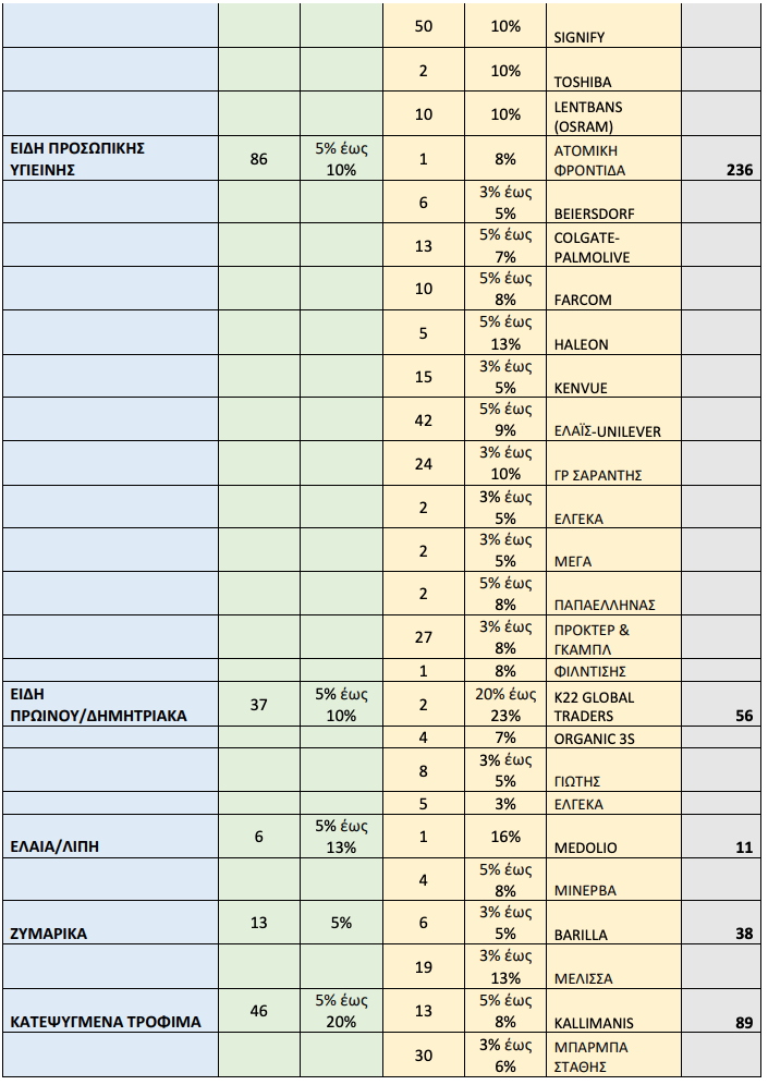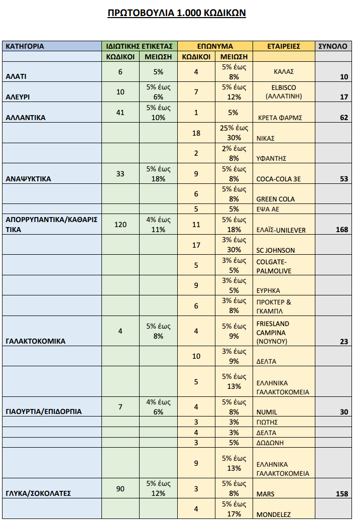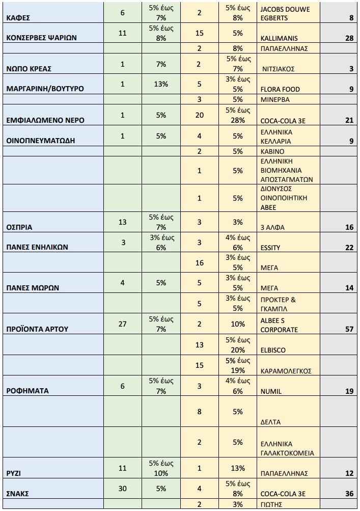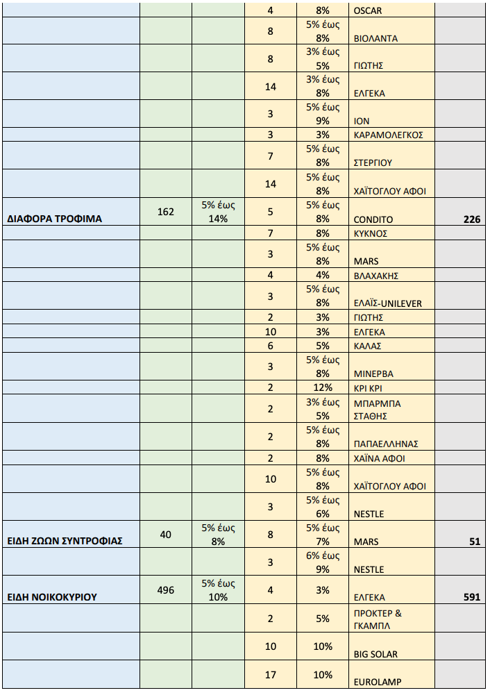 - Κατεψυγμένα τρόφιμα: 46 κωδικοί, με μειώσεις από 5% έως 20%.
