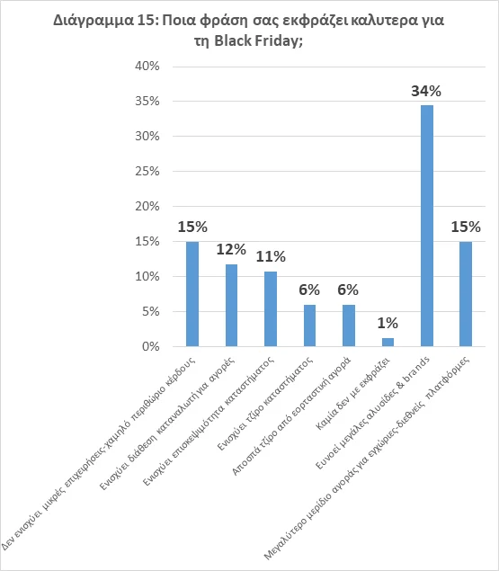 - Την αξία της πρακτικής της “Black Friday” αμφισβητεί το 64% των επιχειρήσεων σωρευτικά, θεωρώντας ότι ευνοεί τις μεγάλες αλυσίδες-brands, προσφέρει μεγαλύτερο μερίδιο αγοράς σε εγχώριες και διεθνείς πλατφόρμες, ενώ δεν ευνοεί τις μικρές λόγω χαμηλού περιθωρίου κέρδους.