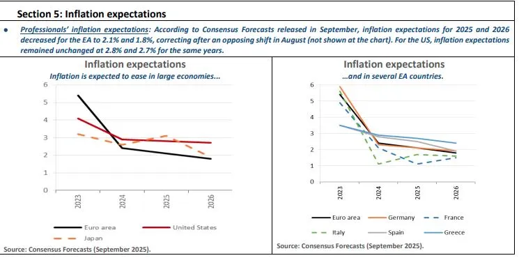 Ο HICP αναθεωρείται σημαντικά προς τα πάνω στο 3,1% (από 2,5%) το 2025 και στο 2,6% (από 2,1%) το 2026. Οι αναθεωρήσεις αυτές οφείλονται στον υψηλότερο (και πιο επίμονο από το αναμενόμενο) πληθωρισμό των υπηρεσιών και των τροφίμων.