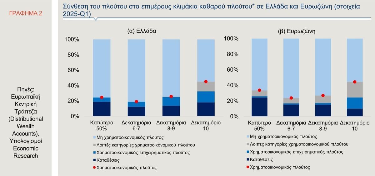 Επιπρόσθετα, είναι χρήσιμο να εξεταστεί ενδελεχώς η κατανομή του μεταξύ των νοικοκυριών και η σύγκριση με την Ευρωζώνη, χρησιμοποιώντας την ταξινόμηση των νοικοκυριών σε δεκατημόρια καθαρού πλούτου. Στην Ελλάδα, ο ακαθάριστος πλούτος για το 90% των νοικοκυριών προέρχεται κυρίως από τα ακίνητα -γεγονός που συνδέεται με το υψηλό ποσοστό ιδιοκατοίκησης που καταγράφεται διαχρονικά στη χώρα μας- και δευτερευόντως από τις καταθέσεις και τον χρηματοοικονομικό επιχειρηματικό πλούτο. Όσον αφορά στο «πλουσιότερο» 10% των νοικοκυριών στην Ελλάδα, υπάρχει μεγαλύτερη διαφοροποίηση στα περιουσιακά στοιχεία που διακρατούν.