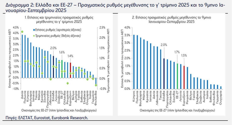 Η υπεραπόδοση της ελληνικής οικονομίας έναντι της ΕΕ-27 και της Ευρωζώνης συνεχίστηκε το γ’ τρίμηνο 2025, έστω και με ηπιότερο ρυθμό σε σύγκριση με τα προηγούμενα τρίμηνα (βλ. Διάγραμμα 2.1). Στο 9μηνο Ιανουαρίου-Σεπτεμβρίου 2025 ο ετήσιος πραγματικός ρυθμός μεγέθυνσης της Ελλάδας ήταν ο 10ος υψηλότερος ανάμεσα στις χώρες της ΕΕ-27 και ο 7ος υψηλότερος ανάμεσα στις χώρες της Ευρωζώνης (βλ. Διάγραμμα 2.2). Στην πρώτη θέση ήταν η Κύπρος με ανάπτυξη 3,5%, και ακολούθησαν: Πολωνία (3,5%), Βουλγαρία (3,4%), Μάλτα (3,2%), Κροατία (3,1%), Ισπανία (3,0%), Δανία (2,8%), Λιθουανία (2,8%), Τσεχία (2,6%), Ελλάδα (2,0%), Πορτογαλία (1,9%), Ολλανδία (1,9%), Σουηδία (1,8%), ΕΕ-27 (1,7%), Λετονία (1,6%), Ευρωζώνη (1,5%), Ρουμανία (1,4%), Βέλγιο (1,0%), Γαλλία (0,8%), Σλοβακία (0,8%), Σλοβενία (0,7%), Αυστρία (0,6%), Ιταλία (0,6%), Εσθονία (0,3%), Φινλανδία (0,3%), Γερμανία (0,3%) και Ουγγαρία (0,2%). Τέλος, θα πρέπει να σημειώσουμε ότι το ποιοτικό χαρακτηριστικό της υπεραπόδοσης της ελληνικής οικονομίας έναντι της ΕΕ-27 και της Ευρωζώνης θα πρέπει να διατηρηθεί για πάρα πολλά χρόνια έτσι ώστε να μειωθεί σε έναν βαθμό η απόσταση που χωρίζει την Ελλάδα σε σύγκριση με την ΕΕ-27 και την Ευρωζώνη σε όρους κατά κεφαλήν ΑΕΠ. Βάσει των στοιχείων του 2024, το κατά κεφαλήν ΑΕΠ της Ελλάδας σε μονάδες αγοραστικής δύναμης διαμορφώθηκε στο 70% της ΕΕ-27 (από 93% το 2008).