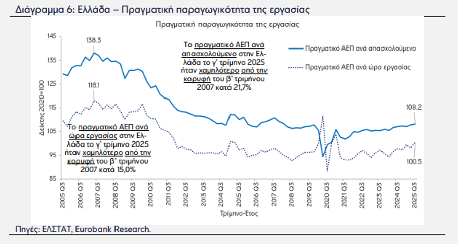 Βάσει των εποχικά διορθωμένων στοιχείων των εθνικών λογαριασμών, το πραγματικό ΑΕΠ ανά απασχολούμενο, δηλαδή η παραγωγικότητα της εργασίας σε όρους απασχολούμενων ατόμων, σημείωσε αύξηση το γ’ τρίμηνο 2025 κατά 0,3% σε τριμηνιαία βάση και κατά 1,0% σε ετήσια βάση. Την ίδια περίοδο, το πραγματικό ΑΕΠ ανά ώρα εργασίας, δηλαδή η παραγωγικότητα της εργασίας σε όρους ωρών εργασίας, ενισχύθηκε κατά 2,2% σε τριμηνιαία βάση και κατά 2,5% σε ετήσια βάση. Στο 9μηνο Ιανουαρίου-Σεπτεμβρίου 2025, το πραγματικό ΑΕΠ ανά απασχολούμενο κατέγραψε ετήσια αύξηση κατά 1,2% και το πραγματικό ΑΕΠ ανά ώρα εργασίας κινήθηκε ανοδικά κατά 3,1%. Δεδομένων των τρεχουσών αρνητικών δημογραφικών τάσεων της Ελλάδας και των περιορισμών σε ό,τι αφορά την περαιτέρω μείωση του ποσοστού ανεργίας και την αύξηση του ποσοστού συμμετοχής του πληθυσμού στο εργατικό δυναμικό, η ενίσχυση της παραγωγικότητας της εργασίας (μεταρρυθμίσεις και παραγωγικές επενδύσεις) καθίσταται επιβεβλημένη έτσι ώστε η ελληνική οικονομία να συνεχίσει να αναπτύσσεται με ικανοποιητικούς ρυθμούς και τα επόμενα χρόνια. Όπως παρουσιάζεται στο Διάγραμμα 6, το πραγματικό ΑΕΠ ανά απασχολούμενο στην Ελλάδα το γ’ τρίμηνο 2025 ήταν χαμηλότερο από την κορυφή του β’ τριμήνου 2007 κατά 21,7% (κατά 15,0% σε όρους ωρών εργασίας).