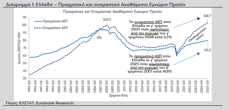 Η διατήρηση ικανοποιητικών ρυθμών μεγέθυνσης καθίσταται αναγκαία έτσι ώστε η ελληνική οικονομία να ανακτήσει σταδιακά τις απώλειες της πολυετούς κρίσης χρέους σε όρους πραγματικού ΑΕΠ (-27,0% στον πυθμένα της κρίσης το 2013). Εξίσου σημαντικό είναι να ενισχυθεί η ανθεκτικότητά της έναντι πιθανών μελλοντικών διεθνών κρίσεων (βελτίωση της διαρθρωτικής ανταγωνιστικότητας και αύξηση της εθνικής αποταμίευσης). Συνεπώς, ο στόχος είναι διττός, δηλαδή, πρώτον διατήρηση της ανάπτυξης, και δεύτερον, ενίσχυση της βιωσιμότητας του υποδείγματος μεγέθυνσης της οικονομίας. Όπως παρουσιάζεται στο Διάγραμμα 1, το πραγματικό ΑΕΠ στην Ελλάδα το γ’ τρίμηνο 2025 ήταν χαμηλότερο από την κορυφή του β’ τριμήνου 2007 κατά 14,8%, ενώ το αντίστοιχο μέγεθος σε τρέχουσες τιμές, ωθούμενο και από τις πληθωριστικές πιέσεις των τελευταίων ετών, ξεπέρασε την κορυφή του γ’ τριμήνου 2008 κατά 3,5%. Ως μέτρο ευημερίας μιας οικονομίας, αν και με αρκετές ατέλειες, πάντα επιλέγεται το πραγματικό ΑΕΠ.
