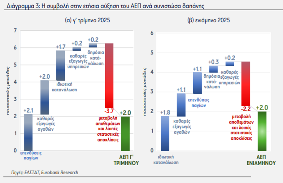 Αντίθετα, η μεταβολή των αποθεμάτων και οι λοιπές στατιστικές αποκλίσεις παρέμειναν σε αρνητικό έδαφος από την αρχή του 2025 –έναντι πολύ μεγάλων αυξήσεων το 2024– αφαιρώντας από την ετήσια ανάπτυξη 3,7 π.μ., σχεδόν το διπλάσιο του συνόλου. Η πηγή αυτών των διακυμάνσεων παραμένει απροσδιόριστη, καθώς πρόκειται για ένα υπολειμματικό μέγεθος το οποίο δεν περιλαμβάνει μόνο τη μεταβολή των φυσικών αποθεμάτων αγαθών, αλλά και ημιτελή επενδυτικά έργα (τα οποία μεταπίπτουν στις επενδύσεις παγίων όταν ολοκληρώνονται) αλλά και τυχόν αναντιστοιχίες στις μετρήσεις του ΑΕΠ ως δαπάνη και ως παραγωγή. Σε κάθε περίπτωση, η επιδιωκόμενη επιτάχυνση των έργων του ΤΑΑ, προκειμένου να μην χαθούν πόροι λόγω της λήξης του προγράμματος το 2026, αναμένεται να παρέχει στήριξη στις επενδύσεις τα επόμενα τρίμηνα.