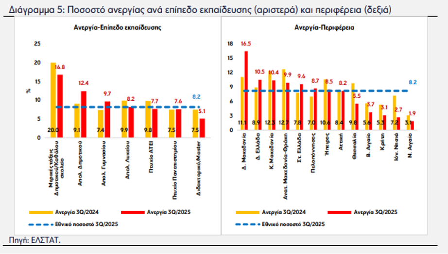 Με βάση το φύλο, τόσο στους άνδρες (6,2% από 7,0%, -0,8 π.μ.) όσο και στις γυναίκες (10,6% από 11,5%, -0,9 π.μ.) το ποσοστό ανεργίας παρουσιάζεται μειωμένο, ωστόσο το ποσοστό συμμετοχής στην αγορά εργασίας των γυναικών καθώς και των νέων ηλικίας 20-24 ετών (46,0% και 51,2% αντίστοιχα) παραμένουν χαμηλότερα από το εθνικό ποσοστό (53,3%). Ο αριθμός των μακροχρόνια ανέργων που από το δ’ τρίμηνο 2023 βρίσκεται κάτω από τους 300,0 χιλ., περιορίστηκε περαιτέρω σε ετήσια βάση το γ’ τρίμηνο 2025 κατά 11,2 χιλ. (στους 230,8 χιλ.) αλλά το ποσοστό μακροχρόνιας ανεργίας αυξήθηκε στο 58,7% από 56,5% ένα έτος νωρίτερα. Με βάση το επίπεδο εκπαίδευσης το χαμηλότερο ποσοστό ανεργίας εντοπίζεται στους κατόχους Διδακτορικού/Μεταπτυχιακού (5,1% από 7,5%) και το υψηλότερο σε άτομα που παρακολούθησαν μερικές τάξεις Δημοτικού/Δεν πήγαν καθόλου σχολείο (16,8% από 20,0%). Σημειώνεται πως σε τρεις κατηγορίες (πτυχίο ανώτατων σχολών, απολυτήριο Γυμνασίου, απολυτήριο Δημοτικού) το ποσοστό ανεργίας αυξήθηκε (στο 7,6%, 9,7% και 12,4%, αντίστοιχα) και στις υπόλοιπες τέσσερις μειώθηκε.
