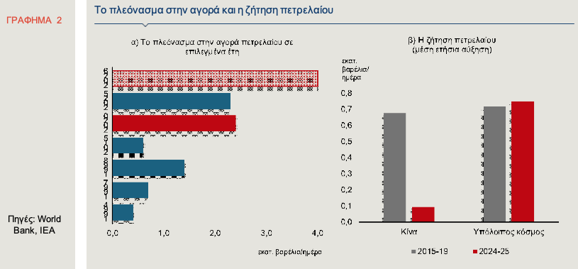 Από την άλλη πλευρά, φέτος, η παγκόσμια οικονομία επηρεάστηκε από την αύξηση των αμερικανικών δασμών που διατάραξε σημαντικά τις εμπορικές ροές και οδήγησε σε επιβράδυνση της αύξησης της ζήτησης πετρελαίου, ιδίως από μεγάλους καταναλωτές ενέργειας, όπως η Κίνα και η Ευρωπαϊκή Ένωση. Επιπλέον, η ευρεία χρήση των ηλεκτρικών οχημάτων, οι βελτιώσεις στην ενεργειακή απόδοση και ο περιορισμός της χρήσης πετρελαίου στα ενεργειακά συστήματα μείωσαν διαρθρωτικά τη ζήτηση πετρελαίου (Energy Market Outlook 2026, ABN AMRO, November 2025). Η Παγκόσμια Τράπεζα (Commodity Markets Outlook, October 2025) εκτιμά ότι η ζήτηση πετρελαίου αυξήθηκε μόνο κατά 0,8 εκατ. βαρέλια την ημέρα (0,7% σε ετήσια βάση) το τρίτο τρίμηνο του 2025, αντανακλώντας υποτονικότερη ζήτηση σε σχέση με τα προηγούμενα έτη. Ειδικά, όσον αφορά την Κίνα που είναι από τους μεγαλύτερους καταναλωτές ενέργειας παγκοσμίως, τα τελευταία δύο χρόνια, η αύξηση της ζήτησης πετρελαίου ήταν σημαντικά χαμηλότερη από τον μέσο όρο της περιόδου 2015-19, επηρεάζοντας πτωτικά τις τιμές του, ενώ η αύξηση στον υπόλοιπο κόσμο παρέμεινε σε γενικές γραμμές σταθερή (Γράφημα 2β). Η τάση αυτή αναμένεται να συνεχισθεί και το 2026, δηλαδή η κατανάλωση πετρελαίου στις προηγμένες οικονομίες προβλέπεται να παραμείνει σχετικά σταθερή, ενώ η αύξηση στην Κίνα θα είναι πιθανώς μέτρια, λόγω και της επιταχυνόμενης υιοθέτησης ηλεκτρικών και υβριδικών οχημάτων.