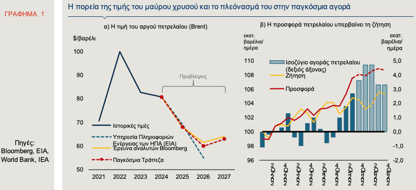 Σημειώθηκαν μόνο λιγοστές βραχυπρόθεσμες αυξήσεις, ως αντίδραση σε γεωπολιτικά γεγονότα, όπως για παράδειγμα στα μέσα Ιουνίου λόγω του πολέμου μεταξύ Ισραήλ και Ιράν και στα τέλη Οκτωβρίου, μετά την ανακοίνωση των νέων αμερικανικών κυρώσεων σε ρωσικές πετρελαϊκές εταιρείες. Σύμφωνα με πρόσφατη έκθεση της Παγκόσμιας Τράπεζας (Commodity Markets Outlook, October 2025), οι τιμές του πετρελαίου κατέγραψαν την τέταρτη συνεχόμενη χρονιά πτώσης και εκτιμάται ότι το 2026 θα υποχωρήσουν στο χαμηλότερο επίπεδο των τελευταίων ετών. Ειδικότερα, η τιμή του πετρελαίου Brent προβλέπεται να κυμανθεί, κατά μέσο όρο, στα 68 $/βαρέλι το 2025 που είναι σημαντική υποχώρηση από τα 81 $/βαρέλι το 2024, να μειωθεί περαιτέρω στα 60 $/βαρέλι το 2026 και στη συνέχεια να αυξηθεί περίπου στα 65 $/βαρέλι (Γράφημα 1α). Η ισχυρή παγκόσμια προσφορά και η υποτονική αύξηση της παγκόσμιας ζήτησης συνέβαλαν στη δημιουργία πλεονάσματος και συνεπώς στην πτώση των τιμών του μαύρου χρυσού, παρά τις συνεχιζόμενες γεωπολιτικές αναταραχές (IMF, World Economic Outlook, October 2025). Πιο συγκεκριμένα: