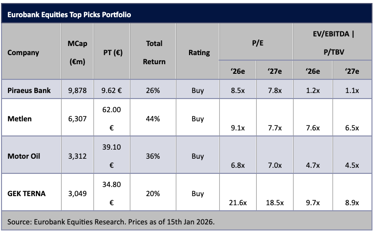 Ωστόσο, η ένταση της ανόδου δημιουργεί υψηλή βάση σύγκρισης για το 2026, ιδίως αν ληφθεί υπόψη ότι ο Γενικός Δείκτης καταγράφει ήδη κέρδη περίπου 6% από την αρχή του έτους. Υπό αυτές τις συνθήκες, η Eurobank Equities εκτιμά ότι η αγορά μεταβαίνει σταδιακά από ένα περιβάλλον καθοδηγούμενο από το γενικό επενδυτικό ρίσκο (beta) σε μια πιο επιλεκτική φάση, με έμφαση στα θεμελιώδη μεγέθη. Το 2026 αναμένεται, συνεπώς, να εξελιχθεί σε «αγορά επιλογής μετοχών», όπου η ποιότητα και η ορατότητα των κερδών θα υπερισχύσουν της περαιτέρω διεύρυνσης των αποτιμησιακών πολλαπλασιαστών.