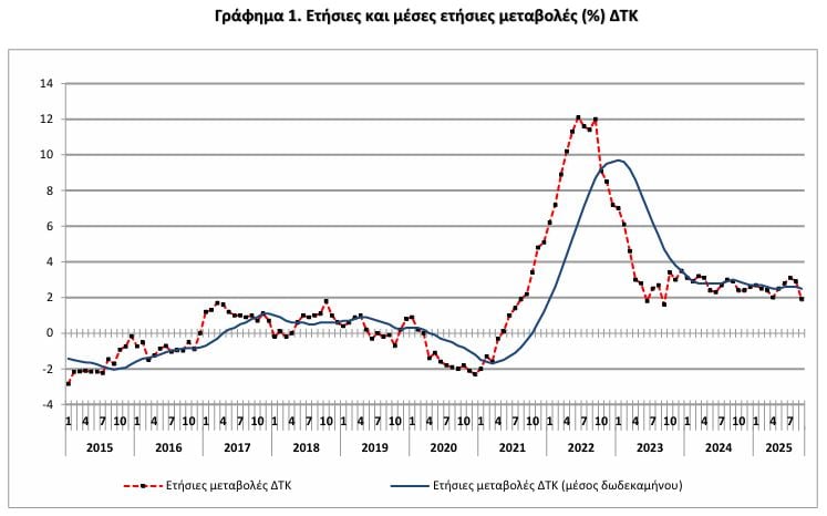 Ο μέσος δείκτης του δωδεκαμήνου Οκτωβρίου 2024 – Σεπτεμβρίου 2025, σε σύγκριση με τον αντίστοιχο Δείκτη του δωδεκαμήνου Οκτωβρίου 2023 – Σεπτεμβρίου 2024, παρουσίασε αύξηση 2,5%, έναντι αύξησης 3,0% που σημειώθηκε κατά την αντίστοιχη σύγκριση του δωδεκαμήνου Οκτωβρίου 2023 – Σεπτεμβρίου 2024 με το δωδεκάμηνο Οκτωβρίου 2022 – Σεπτεμβρίου 2023.