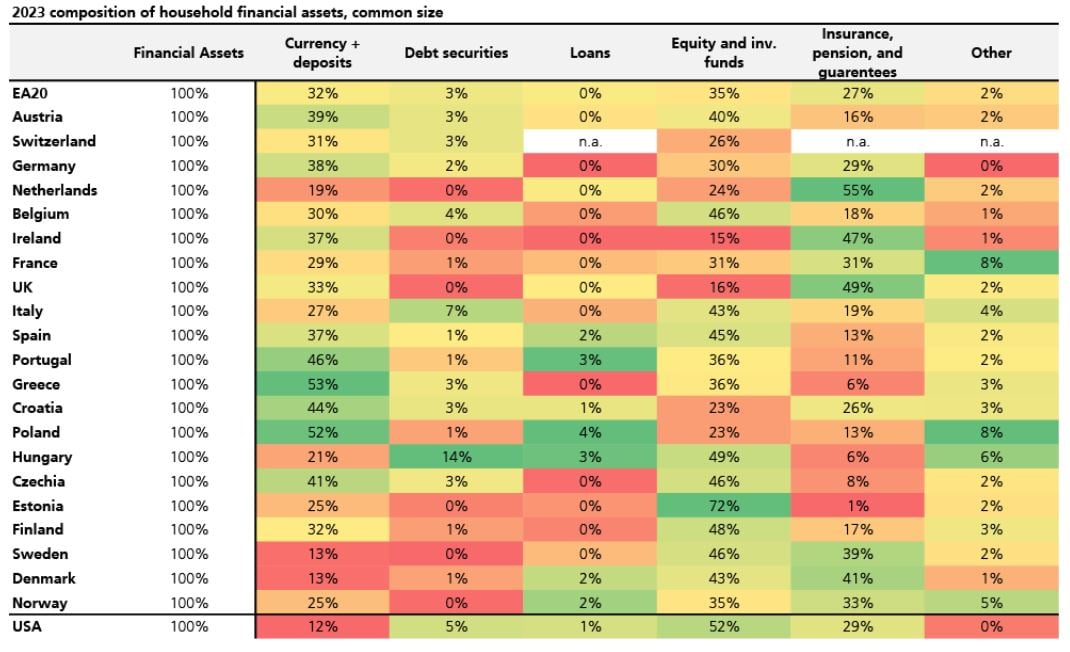 Συγκεκριμένα, τα στοιχεία της UBS δείχνουν ότι το 36% του συνολικού χρηματοοικονομικού πλούτου των Ελλήνων είναι τοποθετημένο σε μετοχές και επενδυτικά κεφάλαια, ενώ πολύ χαμηλό, στο 6%, είναι το μερίδιο των ασφαλιστικών προϊόντων και των συνταξιοδοτικών επενδυτικών προγραμμάτων.