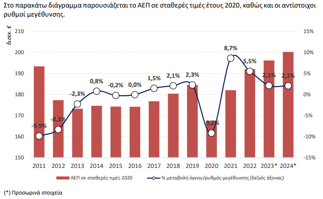 Με βάση τα αναθεωρημένα στοιχεία, το Ακαθάριστο Εγχώριο Προϊόν (ΑΕΠ) του έτους 2024 σε τρέχουσες τιμές παρουσίασε αύξηση κατά 5,4% σε σχέση με το έτος 2023.
