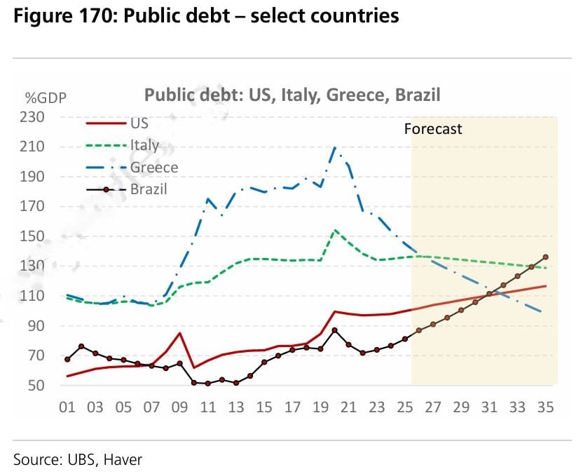 Υπολογίζοντας το επίπεδο του πρωτογενούς ισοζυγίου που απαιτείται για να μην αυξηθεί το χρέος κάθε χώρας, η UBS διαπιστώνει ότι η Βραζιλία είναι η χώρα που βρίσκεται στη χειρότερη κατάσταση, καθώς χρειάζεται πρόσθετη δημοσιονομική προσαρμογή 3,6 ποσοστιαίων μονάδων του ΑΕΠ μόνο για να σταθεροποιήσει το χρέος της στα τρέχοντα επίπεδα. Η δημοσιονομική κατάσταση στη Βραζιλία έχει επιδεινωθεί, κυρίως λόγω του υψηλού επιτοκίου (το επιτόκιο πολιτικής διαμορφώνεται στο 15% και το πραγματικό επιτόκιο επί του χρέους περίπου στο 10%), το οποίο έχει προσθέτει 11 ποσοστιαίες μονάδες του ΑΕΠ στο χρέος, τα τελευταία τρία χρόνια.