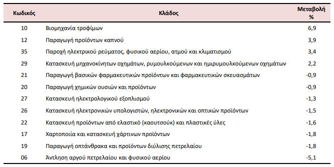 Στην αύξηση του Γενικού Δείκτη Τιμών Εισαγωγών (σύνολο αγοράς) κατά 0,4% συνέβαλαν κυρίως οι μεταβολές των δεικτών των διψήφιων κλάδων της ταξινόμησης NACE Αναθ. 2, ως εξής: