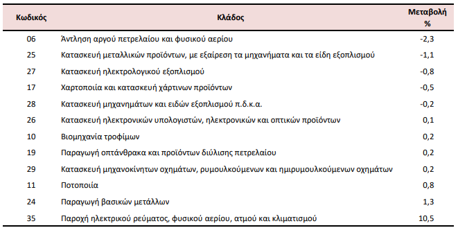 Στη μείωση του Γενικού Δείκτη Τιμών Εισαγωγών (σύνολο αγοράς) κατά 0,2%, συνέβαλαν κυρίως οι μεταβολές των δεικτών των διψήφιων κλάδων της ταξινόμησης NACE Αναθ. 2, ως εξής: