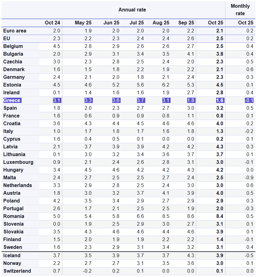 Υποχώρησε στο 1,6% ο πληθωρισμός στην Ελλάδα τον Οκτώβριο - Στο 2,1% στην ευρωζώνη