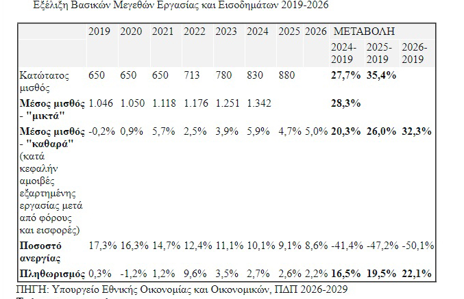 Σύμφωνα με τα στοιχεία του ΠΔΠ, σε σχέση με φέτος, το 2026 αναμένεται αύξηση 5% στις «καθαρές» από φόρους και εισφορές μέσες αμοιβές εξαρτημένης εργασίας, σε σχέση με το 2025, άνοδος υπερδιπλάσια από την αύξηση του πληθωρισμού που αναμένεται να μην ξεπεράσει το 2,2%