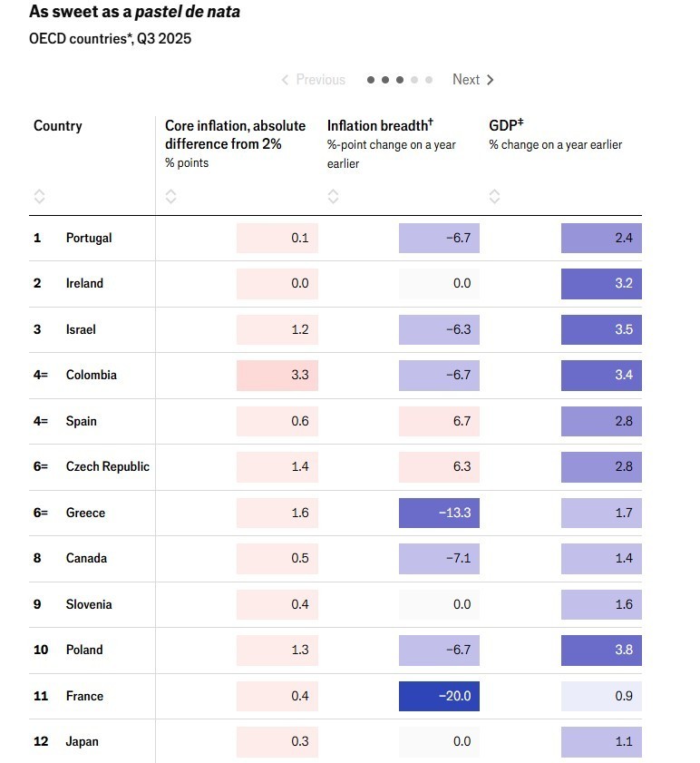 Και φέτος, τα καλά νέα προέρχονται από τον ευρωπαϊκό Νότο. Μετά τη νίκη της Ισπανίας το 2024, η Πορτογαλία κατακτά την κορυφή. Το 2025 συνδύασε ισχυρή ανάπτυξη, χαμηλό πληθωρισμό και δυναμική πορεία στο χρηματιστήριο. Χώρες της ευρωζώνης που δυσκολεύτηκαν τη δεκαετία του 2010 —όπως η Ελλάδα, νικήτρια το 2022 και το 2023, και η Ισπανία— βρίσκονται επίσης ψηλά. Εκτός Ευρώπης, το Ισραήλ συνεχίζει την εντυπωσιακή ανάκαμψη μετά την αναταραχή του 2023. Η Ιρλανδία πλησίασε πολύ στο να πάρει τον τίτλο.