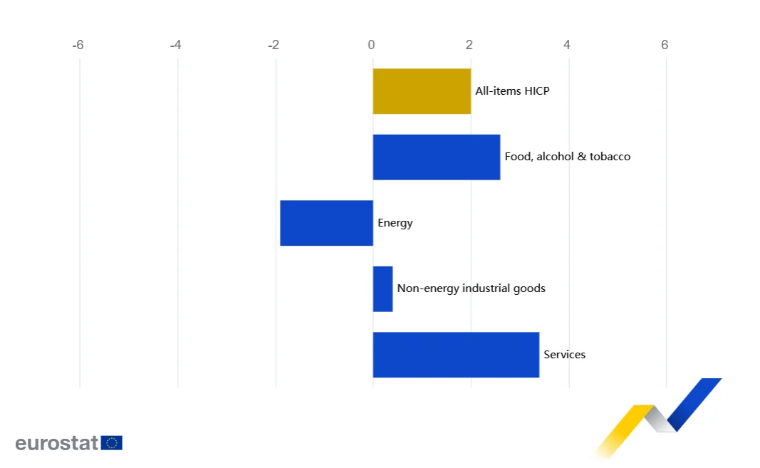 Σε ό,τι αφορά τους επιμέρους τομείς στο μπλοκ του ευρώ, οι υπηρεσίες συνέβαλαν περισσότερο στον τελικό ρυθμό πληθωρισμού με 3,4% τον Δεκέμβριο από 3,5% τον Νοέμβριο. Μικρότερη συνεισφορά είχε η κατηγορία των τροφίμων, του αλκοόλ και του καπνού (2,6% από 2,4% τον Νοέμβριο). Ακολουθούν τα μη ενεργειακά βιομηχανικά αγαθά (0,4% από 0,5% τον προηγούμενο μήνα). Τέλος, ο κλάδος της ενέργειας συνέχισε να κινείται σε αρνητικά επίπεδα, εμφανίζοντας πληθωρισμό -1,9% τον Δεκέμβριο έναντι 0,5% τον Νοέμβριο.