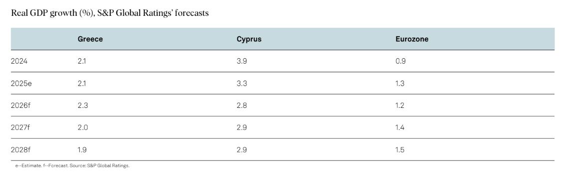 Οι αναλυτές του οίκου χαρακτηρίζουν ευνοϊκές τις προοπτικές ανάπτυξης τόσο για την Ελλάδα όσο και για την Κύπρο, με τους ρυθμούς ανάπτυξης της δεύτερης να εκτιμώνται στο 2,8% φέτος και 2,9% τόσο το 2027 όσο και το 2028. Για την Ευρωζώνη συνολικά, η S&P προβλέπει αύξηση του ΑΕΠ κατά 1,2% φέτος, 1,4% το 2027 και 1,5% το 2028, γεγονός που υπογραμμίζει την υπεραπόδοση των δύο χωρών. Παρά ταύτα, το κατά κεφαλήν ΑΕΠ της Ελλάδας αναμένεται να παραμείνει χαμηλότερο σε σύγκριση με τις υπόλοιπες χώρες της Ευρωζώνης.