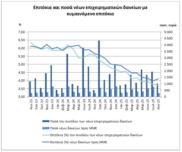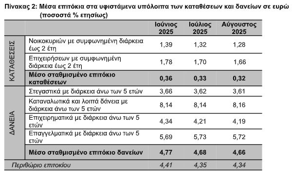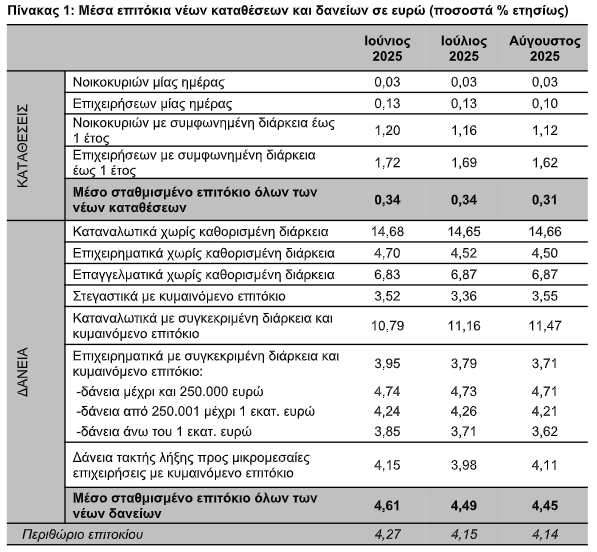 Τον Αύγουστο του 2025, το μέσο σταθμισμένο επιτόκιο του συνόλου των νέων καταθέσεων μειώθηκε κατά 3 μονάδες βάσης, σε σχέση με τον προηγούμενο μήνα, και διαμορφώθηκε στο 0,31%.