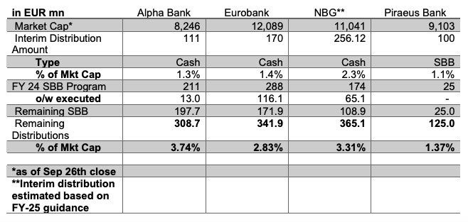 Το πρόγραμμα επαναγοράς ιδίων μετοχών ξεκίνησε στις 17 Σεπτεμβρίου και αφορά 170.000.000 μετοχές, και θα ολοκληρωθεί τους επόμενους 15 μήνες. Παράλληλα, η Τράπεζα έχει ανακοινώσει τη διανομή προμερίσματος ύψους 111 εκατ. ευρώ το Δεκέμβρη του τρέχοντος έτους και αφορά το πρώτο μέρος από το 50% επί των συνολικών κερδών του 2025.