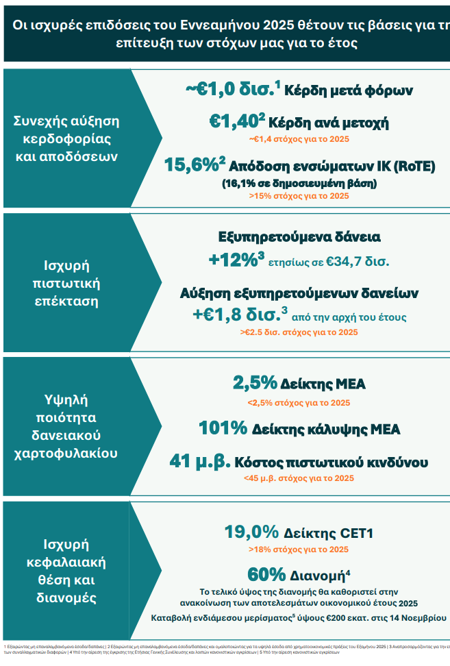 - Τα κέρδη μετά φόρων σε επίπεδο Ομίλου ύψους ~€1,0 δισ. το Εννεάμηνο 2025 απορροφούν την επίδραση της ομαλοποίησης των επιτοκίων