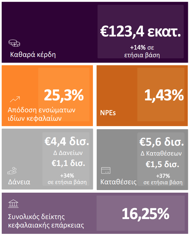 Ο δείκτης CET1 και συνολικής κεφαλαιακής επάρκειας, διαμορφώθηκαν στο 13,24% και 16,25% αντίστοιχα, συμπεριλαμβανομένης της επίδρασης της Βασιλείας 4.