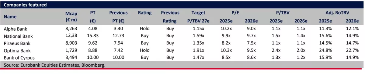 Η αύξηση στις τιμές στόχους αποδίδεται κυρίως στις χαμηλότερες εκτιμήσεις για το κόστος ιδίων κεφαλαίων (-90bps περίπου), και όχι τόσο στις μικρές αναβαθμίσεις κερδοφορίας. Παρά την άνοδο >80% από την αρχή του έτους και τις ελληνικές τράπεζες σε ιστορικά υψηλά 15 ετών, οι αποτιμήσεις παραμένουν ελκυστικές, με P/TBV στο 1,22x και P/E στο 8,7x για το 2026 (σε σύγκριση με 1,50x / 9,7x για τον κλάδο), για RoTE περίπου 14% και μερισματική απόδοση περίπου 6%, σύμφωνα με τη Eurobank Equities.