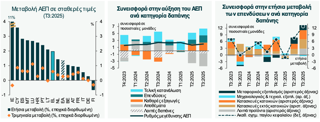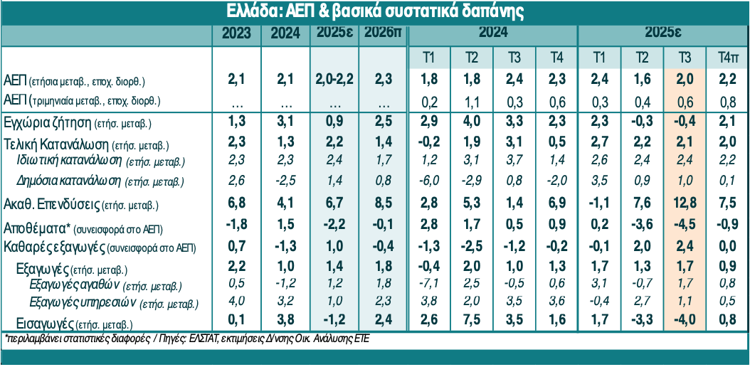 Συνολικά, δεδομένης της ισχυρής επίδοσης του 3ου τριμήνου αλλά και της σημαντικά βελτιωμένης διάρθρωσης του ΑΕΠ − μετά τις αναθεωρήσεις − σε συνδυασμό με τη θετική πορεία βασικών δεικτών υψηλής συχνότητας για το 4ο τρίμηνο και την προγραμματιζόμενη σημαντική δημοσιονομική ώθηση, η πιθανότητα ο ετήσιος ρυθμός ανάπτυξης να υπερβεί το 2,0% για το σύνολο του 2025 εμφανίζεται αυξημένη. Η ανάγκη αναπλήρωσης των αποθεμάτων, σε συνδυασμό με την ανοδική τάση του πραγματικού διαθεσίμου εισοδήματος των νοικοκυριών αλλά και με τους ισχυρούς καταλύτες που τροφοδοτούν τις επενδυτικές δαπάνες, συνιστούν πρόσθετους υποστηρικτικούς παράγοντες για ακόμη ισχυρότερη αναπτυξιακή επίδοση το 2026.