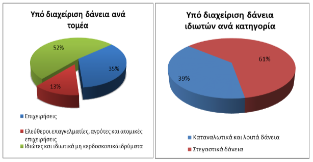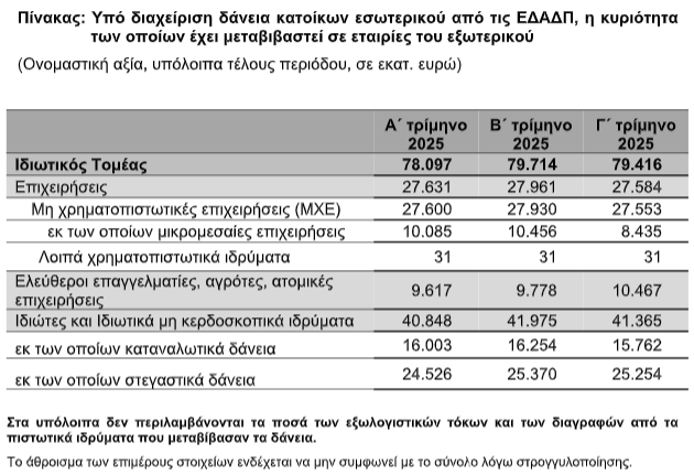 Η ονομαστική αξία των υπό διαχείριση δανείων προς ιδιώτες και ιδιωτικά μη κερδοσκοπικά ιδρύματα μειώθηκε κατά 610 εκατ. ευρώ έναντι του προηγούμενου τριμήνου και διαμορφώθηκε σε 41.365 εκατ. ευρώ στο τέλος του γ΄ τριμήνου του 2025. Αναλυτικότερα, τα υπό διαχείριση καταναλωτικά δάνεια παρουσίασαν μείωση κατά 492 εκατ. ευρώ και διαμορφώθηκαν σε 15.762 εκατ. ευρώ. Τα υπό διαχείριση στεγαστικά δάνεια παρουσίασαν μείωση κατά 116 εκατ. ευρώ και διαμορφώθηκαν σε 25.254 εκατ. ευρώ.