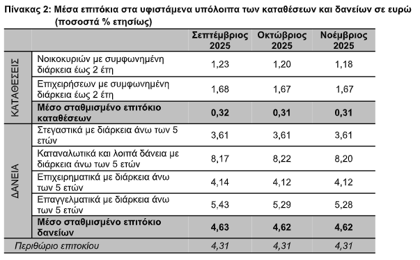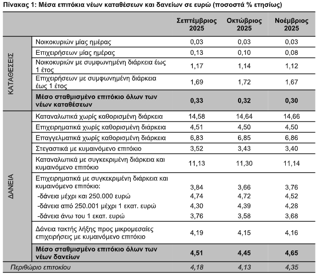 Το Νοέμβριο του 2025, το μέσο σταθμισμένο επιτόκιο των νέων καταθέσεων παρέμεινε σχεδόν αμετάβλητο στο 0,30%, ενώ το αντίστοιχο επιτόκιο των νέων δανείων αυξήθηκε στο 4,65% σύμφωνα με τα στοιχεία της Τράπεζας της Ελλάδος.