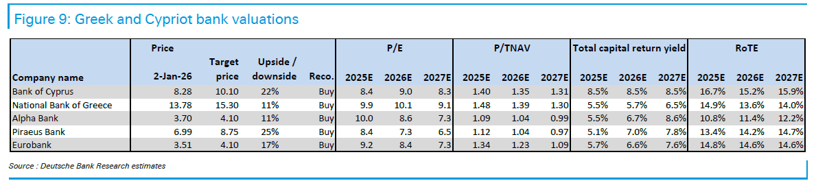 Αν και το re-rating έχει ήδη ξεκινήσει, η Deutsche Bank εκτιμά ότι οι αποτιμήσεις δεν αντανακλούν πλήρως τη μελλοντική δημιουργία αξίας και τις προοπτικές για αυξημένες αποδόσεις κεφαλαίου.