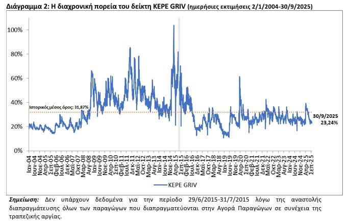 Υποχώρησε τον Σεπτέμβριο ο δείκτης τεκμαρτής μεταβλητότητας KEPE GRIV ή δείκτης «φόβου», φτάνοντας το 23,24% στις 30/9/2025 από το 23,50% στις 29/8/2025.